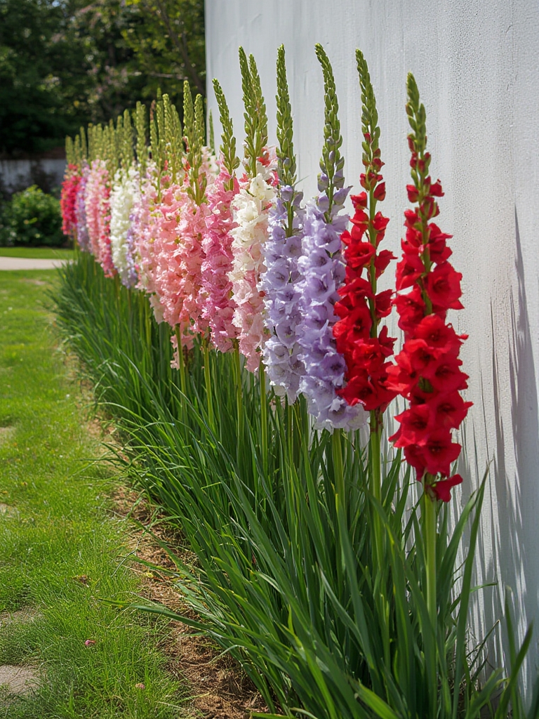 - Back layer (tallest, 4–6 ft): Sunflowers, Delphiniums, or Hollyhocks.
